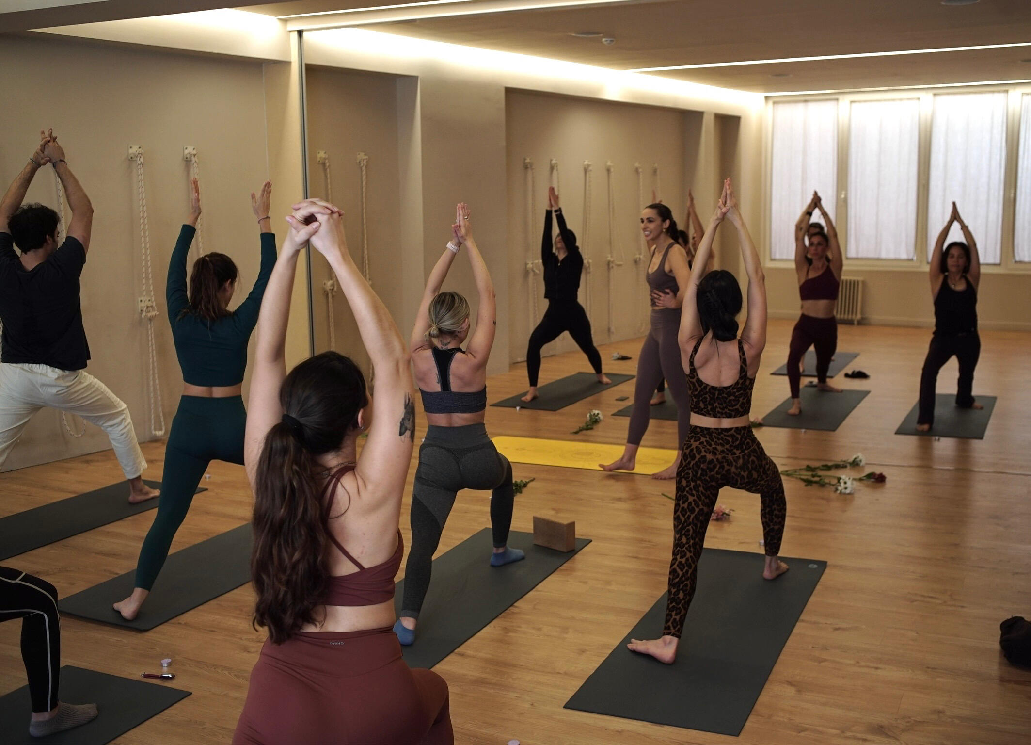 Clases grupales: yoga dinámico en espacios boutique combinando fuerza, fluidez y energía colectiva.